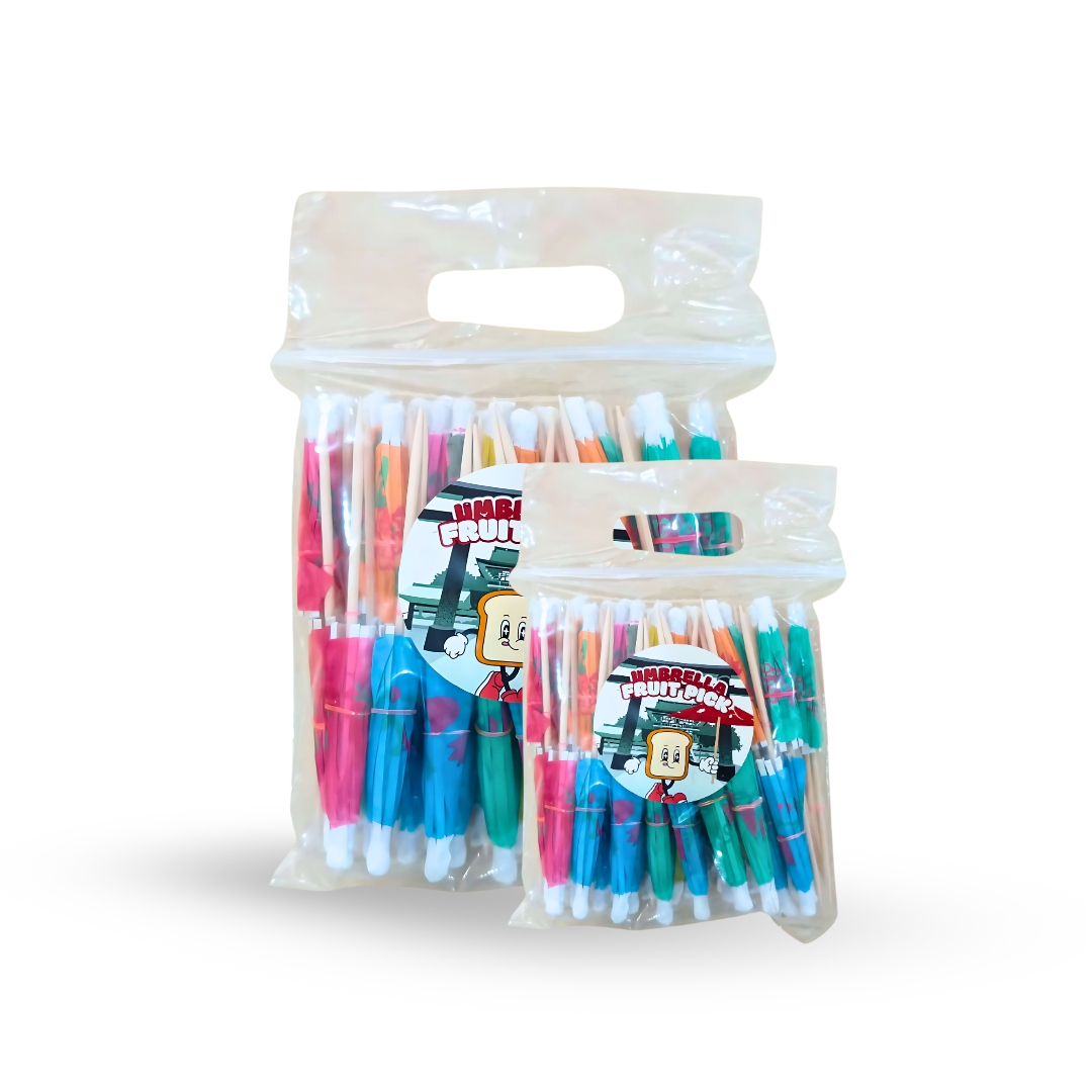 Terbuat dari bahan plastik atau kayu dengan hiasan payung mini yang berwarna-warni di bagian atas tusuk.